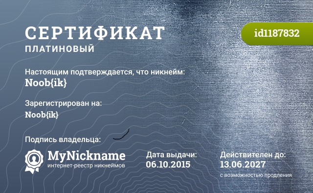 Nickname Noob{ik} is registered to Noob{me}. Issued certificate ID1187832. Issue date 06.10.2015.
