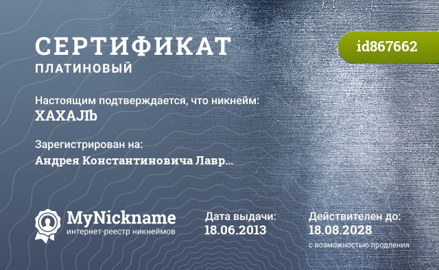 Nickname XAXAJIb is registered to Andrei Konstantinovich Laurel.... Issued certificate ID867662. Issue date 18.06.2013.