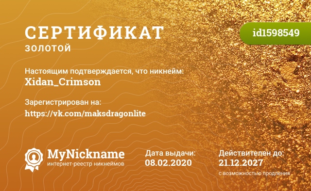 Gold ? certificate for nickname: Xidan_Crimson (id1598549)