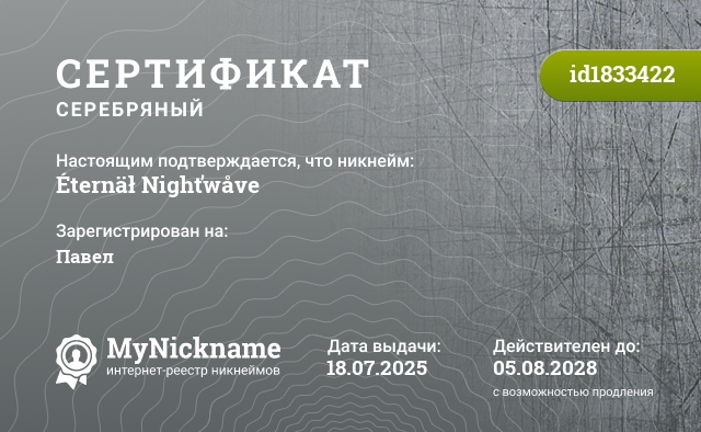 certificate for nickname: Éternäł Nighťwåve (id1833422)