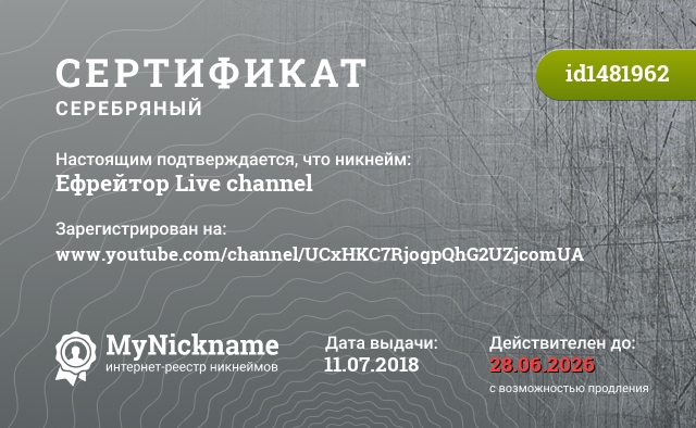сертификат на никнейм Ефрейтор Live channel (id1481962)