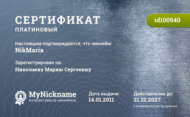 Nickname NikMaria is registered to Nikolaeva Maria Sergeevna. Issued certificate ID100940. Issue date 14.01.2011.