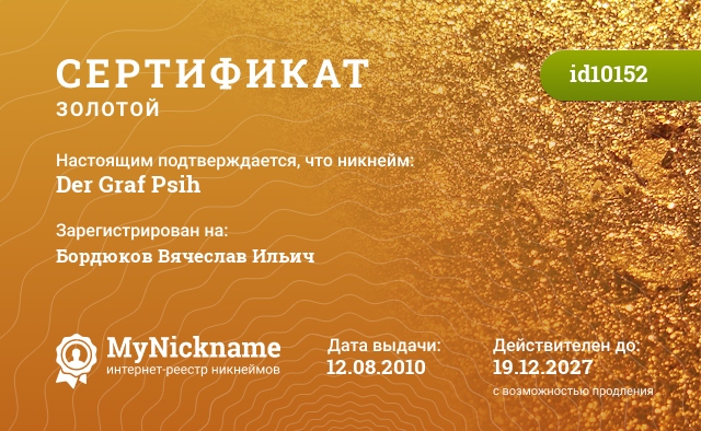Nickname Der Graf Psih is registered to Bordyukov Vyacheslav Ilyich. Issued certificate ID10152. Issue date 12.08.2010.