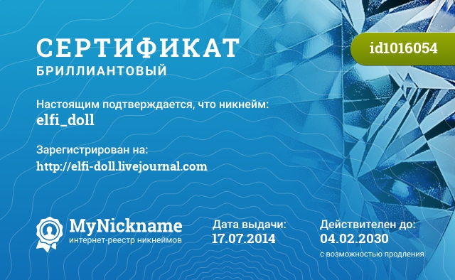 Никнейм elfi_doll зарегистрирован на http://elfi-doll.livejournal.com. Выдан сертификат id1016054. Дата выдачи 17.07.2014.