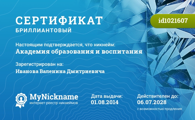 Nickname Академия образования и воспитания is registered to Иванова Валенина Дмитриевича. Issued certificate ID1021607. Issue date 01.08.2014.