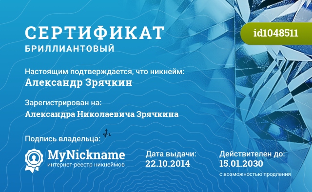 certificate for nickname: Александр Зрячкин (id1048511)