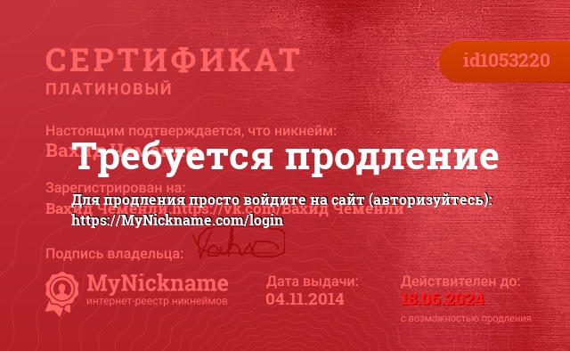 сертификат на никнейм Вахид Чеменли (id1053220)