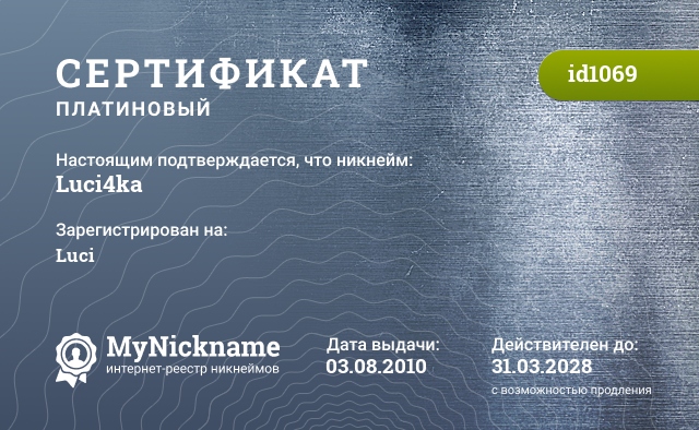 Nickname Luci4ka is registered to Lights. Issued certificate ID1069. Issue date 03.08.2010.