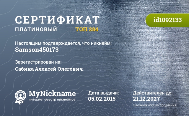 Nickname Samson450173 is registered to Sabina Alexey Olegovich. Issued Platinum certificate ID1092133. Issue date 05.02.2015.