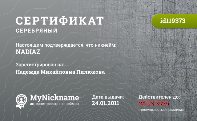 Никнейм NADIAZ зарегистрирован на Надежда Михайловна Пилюкова. Выдан сертификат id119373. Дата выдачи 24.01.2011.