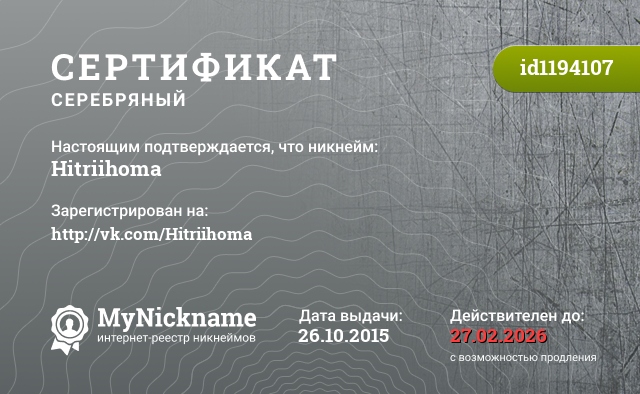 Nickname Hitriihoma is registered to http://vk.com/Hitriihoma. Issued certificate ID1194107. Issue date 26.10.2015.