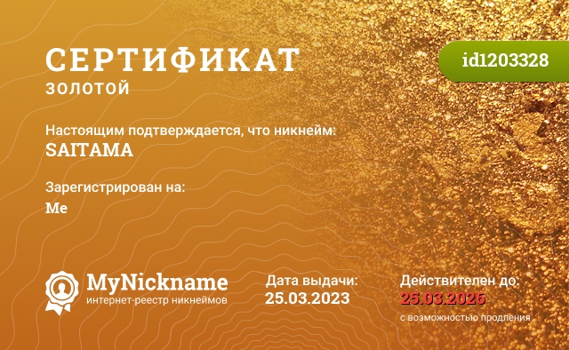 Никнейм SAITAMA зарегистрирован на Me. Выдан сертификат id1203328. Дата выдачи 25.03.2023.