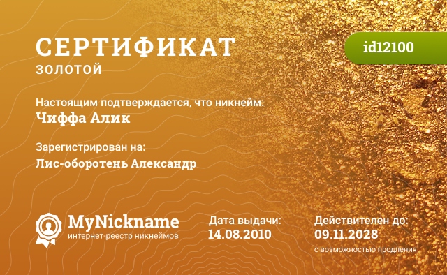 Nickname Чиффа Алик is registered to Fox-werewolf Alexander. Issued certificate ID12100. Issue date 14.08.2010.