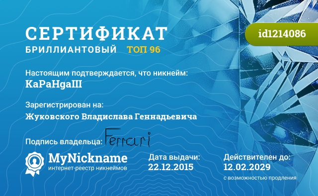 Nickname KaPaHgaIII is registered to Zhukovsky Vladislav Gennadievich. Issued certificate ID1214086. Issue date 22.12.2015.