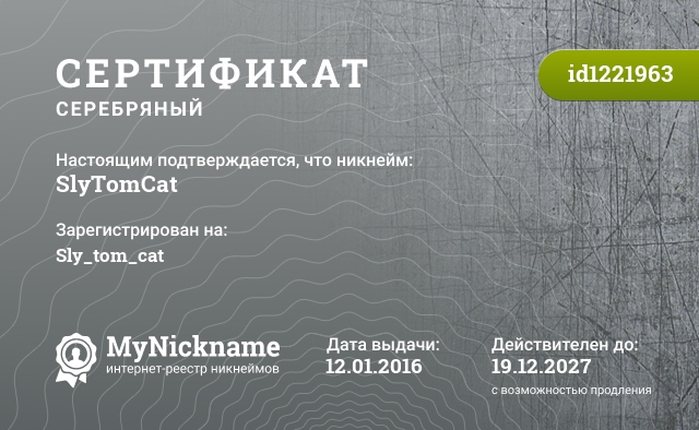 Никнейм SlyTomCat зарегистрирован на Sly_tom_cat. Выдан серебряный сертификат id1221963. Дата выдачи 12.01.2016.