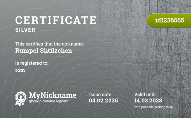 certificate for nickname: Rumpel Shtilzchen (id1236565)