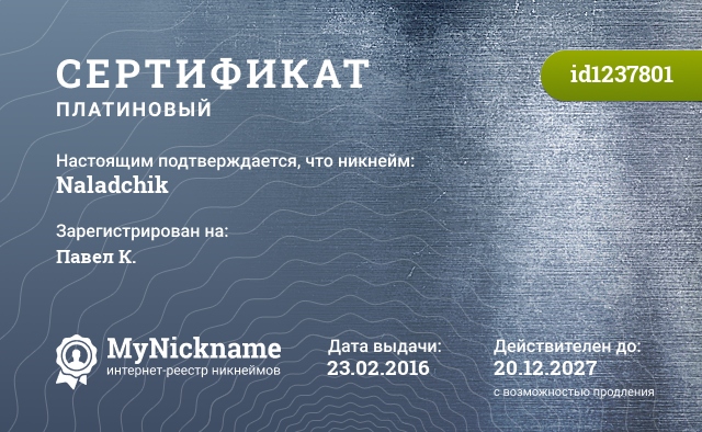 Никнейм Naladchik зарегистрирован на Павел К.. Выдан сертификат id1237801. Дата выдачи 23.02.2016.
