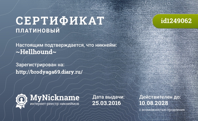 Nickname ~Hellhound~ is registered to http://brodyaga69.diary.ru/. Issued certificate ID1249062. Issue date 25.03.2016.