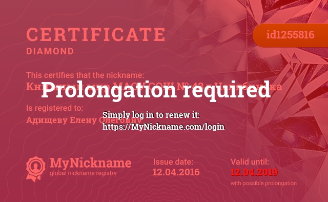 Nickname Книжный мир МАОУ СОШ № 43 г.Челябинска is registered to Адищеву Елену Олеговну. Issued certificate ID1255816. Issue date 12.04.2016.