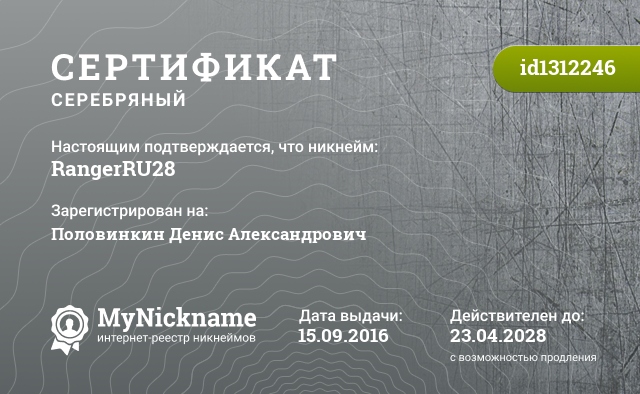 Nickname RangerRU28 is registered to Polovinkin Denis Alexandrovich. Issued certificate ID1312246. Issue date 15.09.2016.