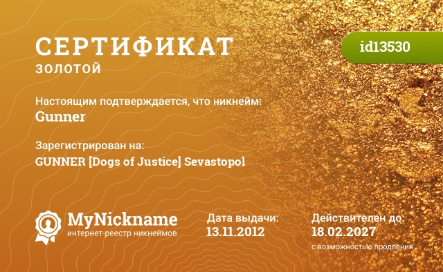 Никнейм Gunner зарегистрирован на GUNNER [Dogs of Justice] Sevastopol. Выдан сертификат id13530. Дата выдачи 13.11.2012.