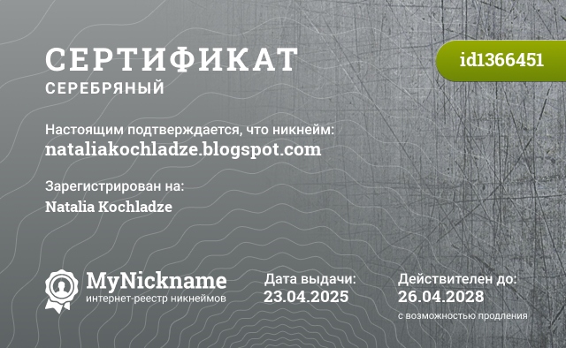 Nickname nataliakochladze.blogspot.com is registered to Natalia Kokhladze. Issued certificate ID1366451. Issue date 23.04.2025.