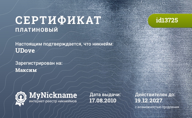 Nickname UDove is registered to Maksim. Issued certificate ID13725. Issue date 17.08.2010.