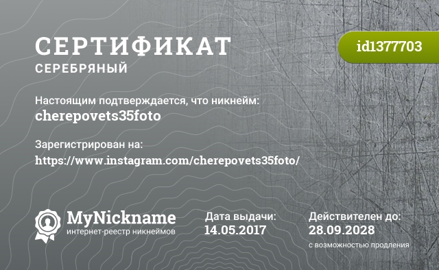 Nickname cherepovets35foto is registered to https://www.instagram.com/cherepovets35foto/. Issued certificate ID1377703. Issue date 14.05.2017.