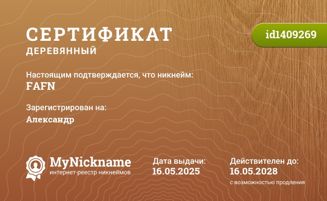 Nickname FAFN is registered to Alexander. Issued certificate ID1409269. Issue date 16.05.2025.