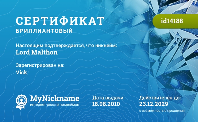 Nickname Lord Malthon is registered to Vick. Issued certificate ID14188. Issue date 18.08.2010.