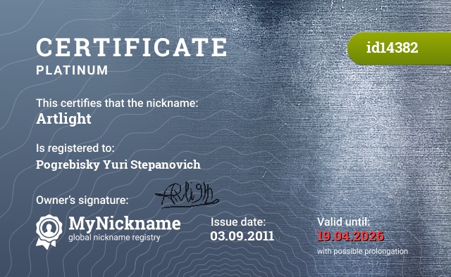 Nickname Artlight is registered to Pogrebisky Yuri Stepanovich. Issued Platinum certificate ID14382. Issue date 03.09.2011.