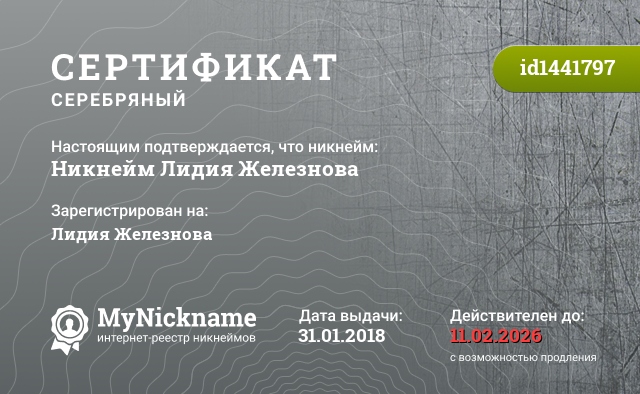 Nickname Никнейм Лидия Железнова is registered to Lydia Zheleznova. Issued certificate ID1441797. Issue date 31.01.2018.