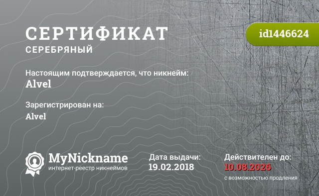 Nickname Alvel is registered to Alvel. Issued certificate ID1446624. Issue date 19.02.2018.