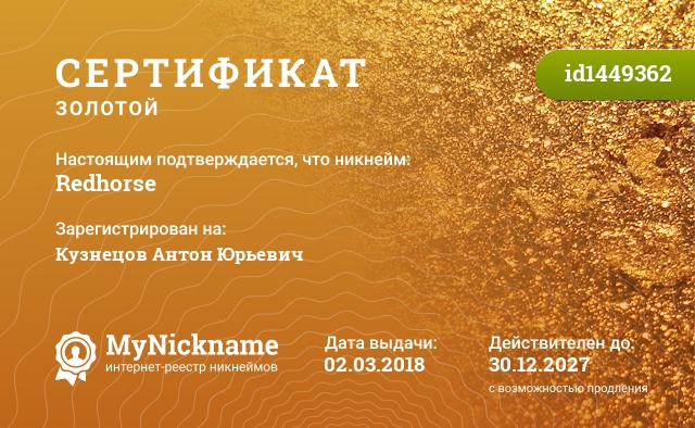 Nickname Redhorse is registered to Kuznetsov Anton Yurevich. Issued certificate ID1449362. Issue date 02.03.2018.
