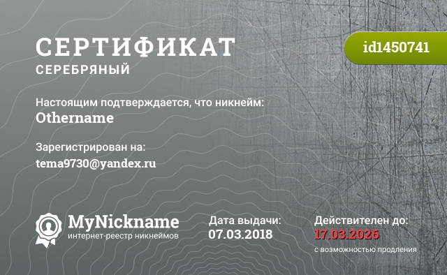 Nickname Othername is registered to tema9730@yandex.ru. Issued certificate ID1450741. Issue date 07.03.2018.