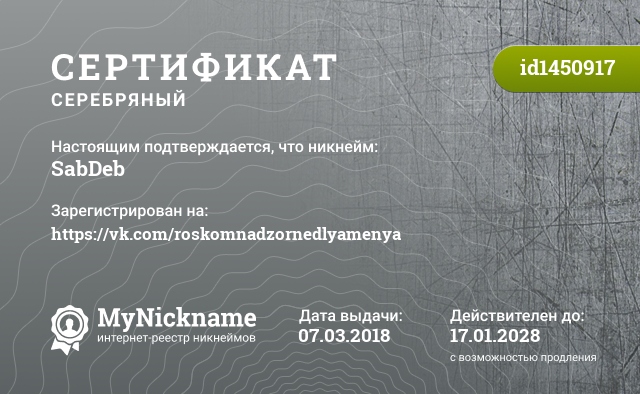 Certificate for nickname SabDeb is registered to: https://vk.com/roskomnadzornedlyamenya