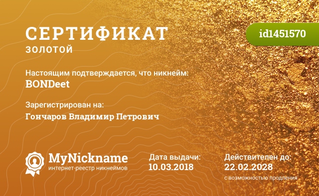 Nickname BONDeet is registered to Goncharov Vladimir Petrovich. Issued certificate ID1451570. Issue date 10.03.2018.