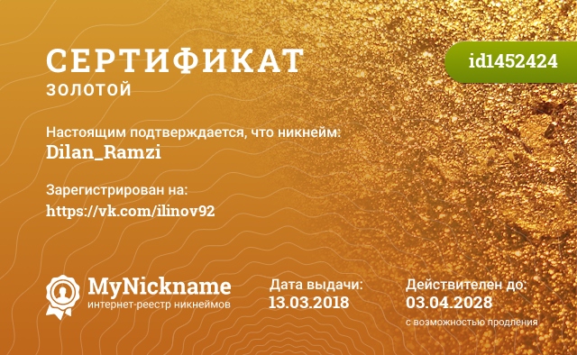 Nickname Dilan_Ramzi is registered to https://vk.com/ilinov92. Issued certificate ID1452424. Issue date 13.03.2018.