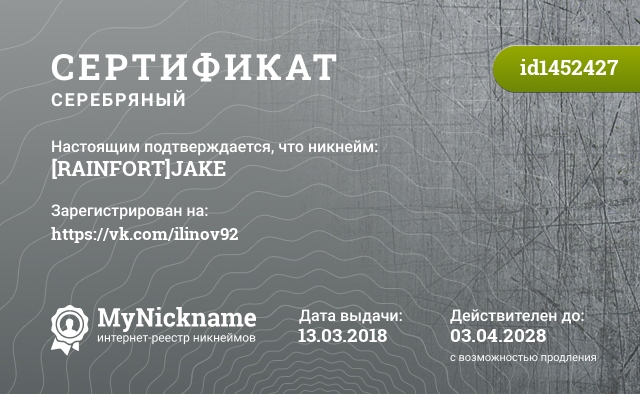 Nickname [RAINFORT]JAKE is registered to https://vk.com/ilinov92. Issued certificate ID1452427. Issue date 13.03.2018.