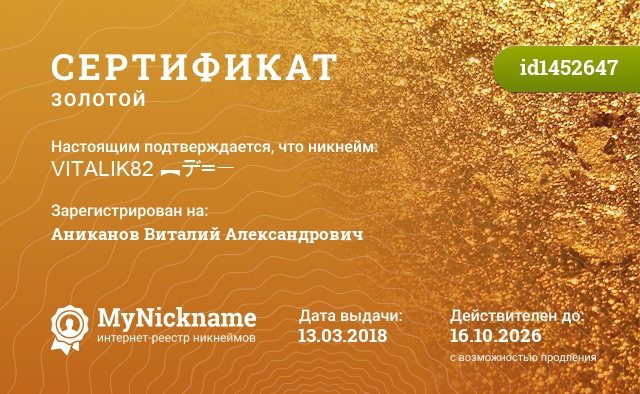 certificate for nickname: VITALIK82 ︻デ═一 (id1452647)