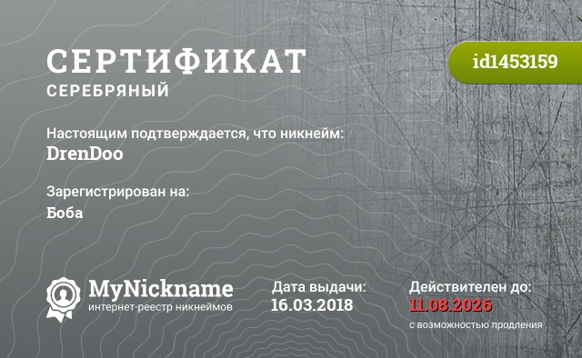 Nickname DrenDoo is registered to Bob. Issued certificate ID1453159. Issue date 16.03.2018.