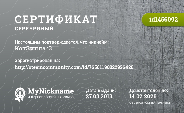 Nickname КотЗилла :3 is registered to http://steamcommunity.com/id/76561198822926428. Issued certificate ID1456092. Issue date 27.03.2018.