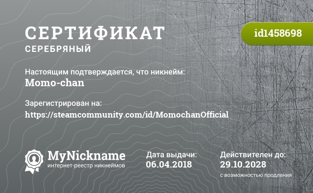Nickname Momo-chan is registered to https://steamcommunity.com/id/MomochanOfficial. Issued certificate ID1458698. Issue date 06.04.2018.