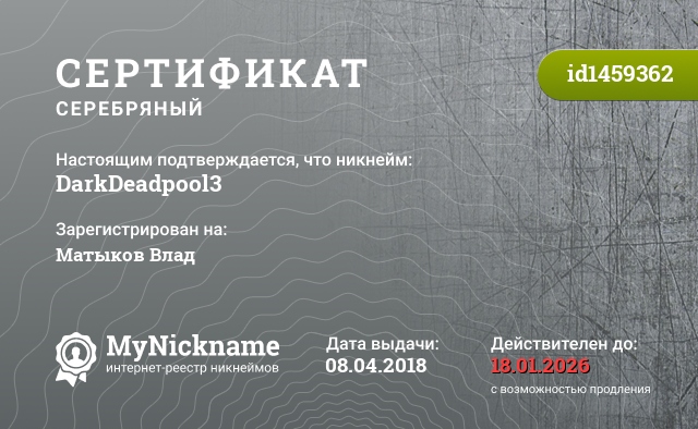Nickname DarkDeadpool3 is registered to Matykov Vlad. Issued certificate ID1459362. Issue date 08.04.2018.
