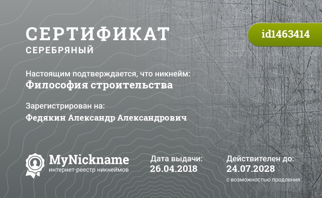 Nickname Философия строительства is registered to Fedyakin Alexander Alexandrovich. Issued certificate ID1463414. Issue date 26.04.2018.