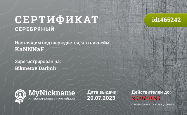 Nickname KaNNNaF is registered to Bikmetov Darimir. Issued certificate ID1465242. Issue date 20.07.2023.