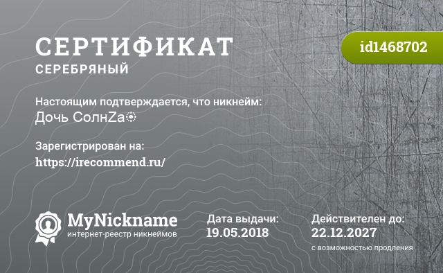 certificate for nickname: Дочь СолнZa❂ (id1468702)