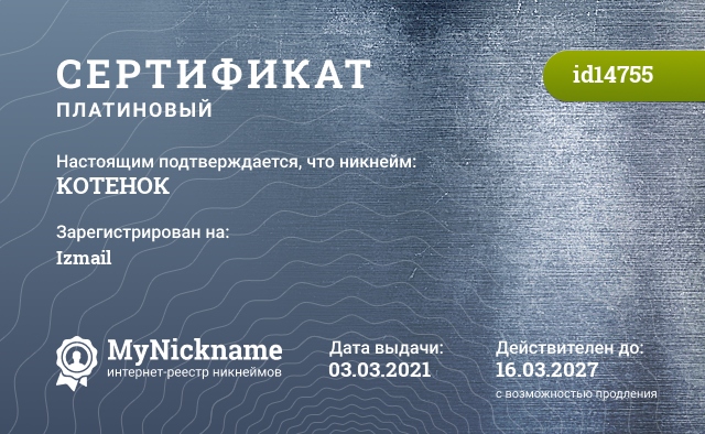 Nickname КОТЕНОК is registered to Izmail. Issued Platinum certificate ID14755. Issue date 03.03.2021.