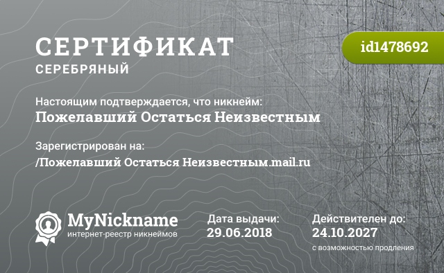 Nickname Пожелавший Остаться Неизвестным is registered to /Пожелавший Остаться Неизвестным.mail.ru. Issued certificate ID1478692. Issue date 29.06.2018.