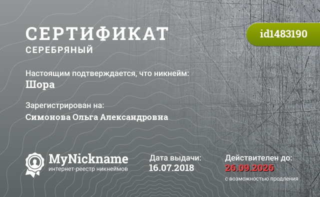 Nickname Шора is registered to Simonova Olga Alexandrovna. Issued certificate ID1483190. Issue date 16.07.2018.